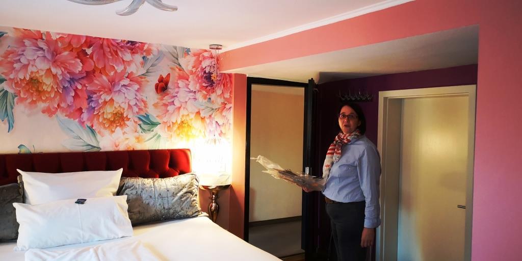Hofgartenzimmer Rose 28 mit Klimaanlage AC: Boxspringbett 200x200cm mit 30cm Taschenfederkernmatratze und 5cm starker Gelax Topper für höchsten Schlafkomfort. Mit Öko-Laminat. Im Haupthaus zum Garten gelegen, im 1.OG ohne Aufzug. Zimmer 28 buchbar mit kleinem Kinderzimmer auf Wunsch und Aufpreis (Zusatzbett buchen) und Verfügbarkeit.