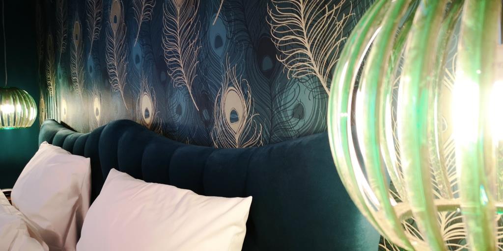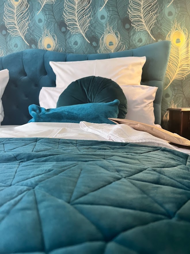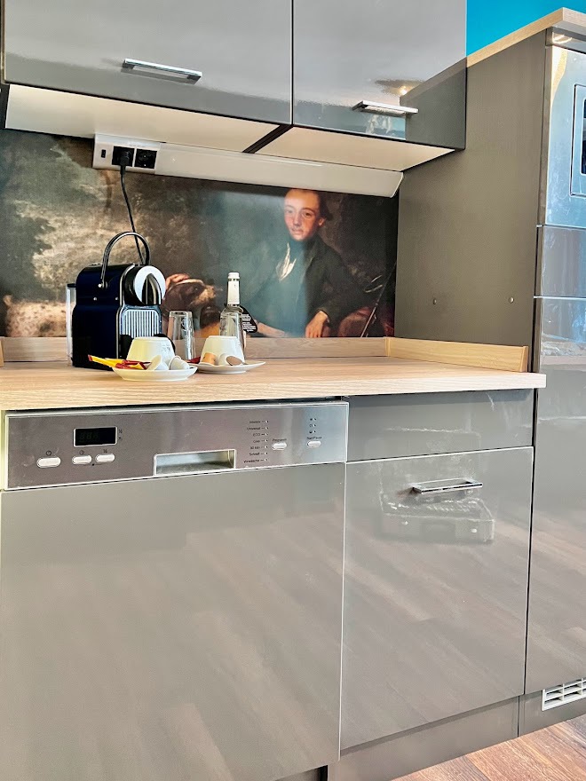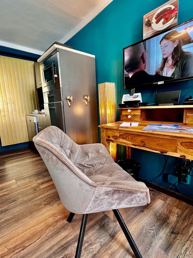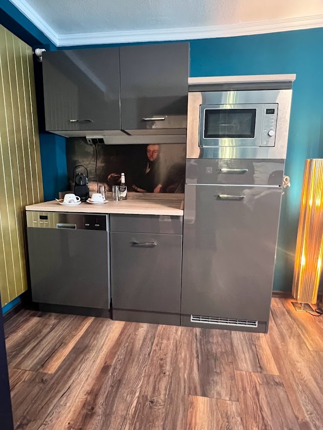Mikro Apartment BIG KING mit Klimaanlage AC, 200 x 200cm Boxspringbett mit 30cm Taschenfederkernmatratze und 5cm starkem Gelax Topper. Pantry Küche mit Kühlschrank mit Eisfach, Mikrowelle, Spülmaschine.